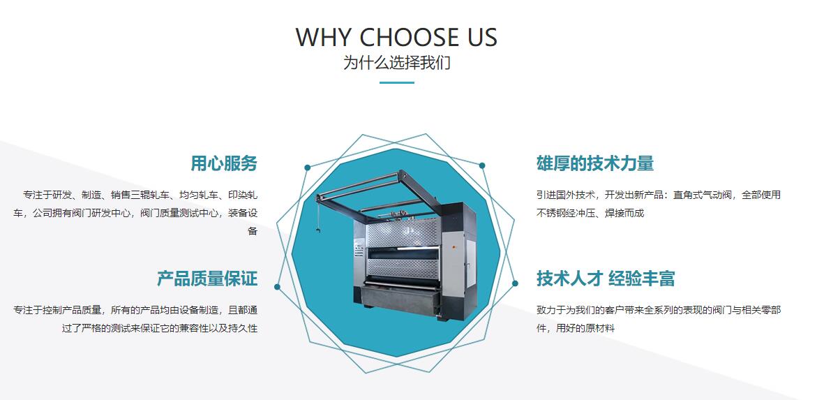 1,专注于研发、制造、销售三辊轧车、均匀轧车、印染轧车,公司拥有阀门研发中心,阀门质量测试中心,装备设备。